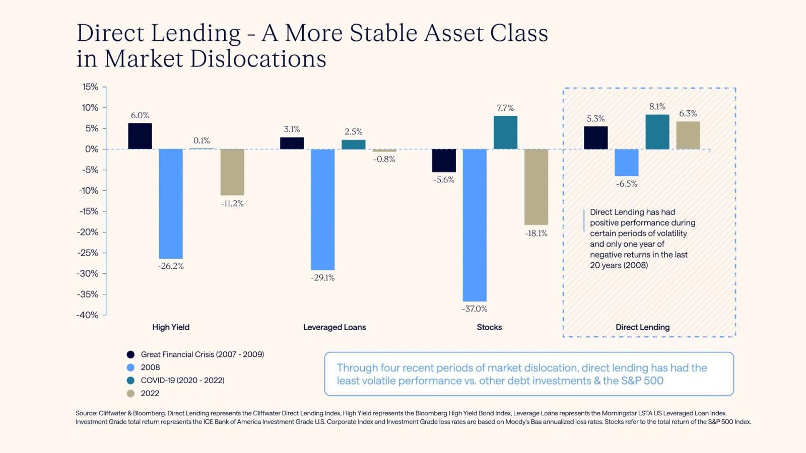 That track record spans the full spectrum of monetary policy conditions—from the ultra-low rates following 2008 and again during COVID, to the Federal Reserve’s recent aggressive tightening cycle that pushed rates to 20-year highs. Through those periods of market volatility, direct lending has had the least volatile performance vs. other debt investments and the S&P 500.